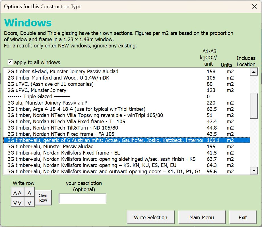 - Built-in library of ~1000 entries, mainly from EPDs, containing the Whole Life info for stages A-D including sequestration for timber/natural materials.
