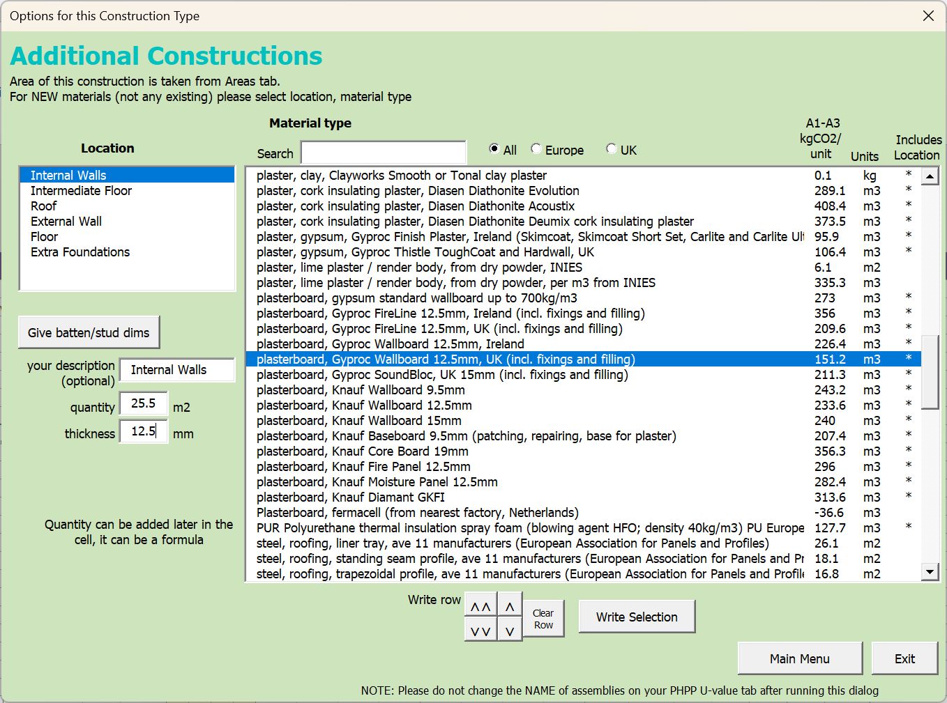 Entering data is easy, you select entries from your U-value calculations in the left 3 boxes and PHribbon matches likely materials on the right. You can also use the search box (as below) if there is a better name for the material. Below are shown the screens for buttons 1,2,3 and 4 in the main menu.