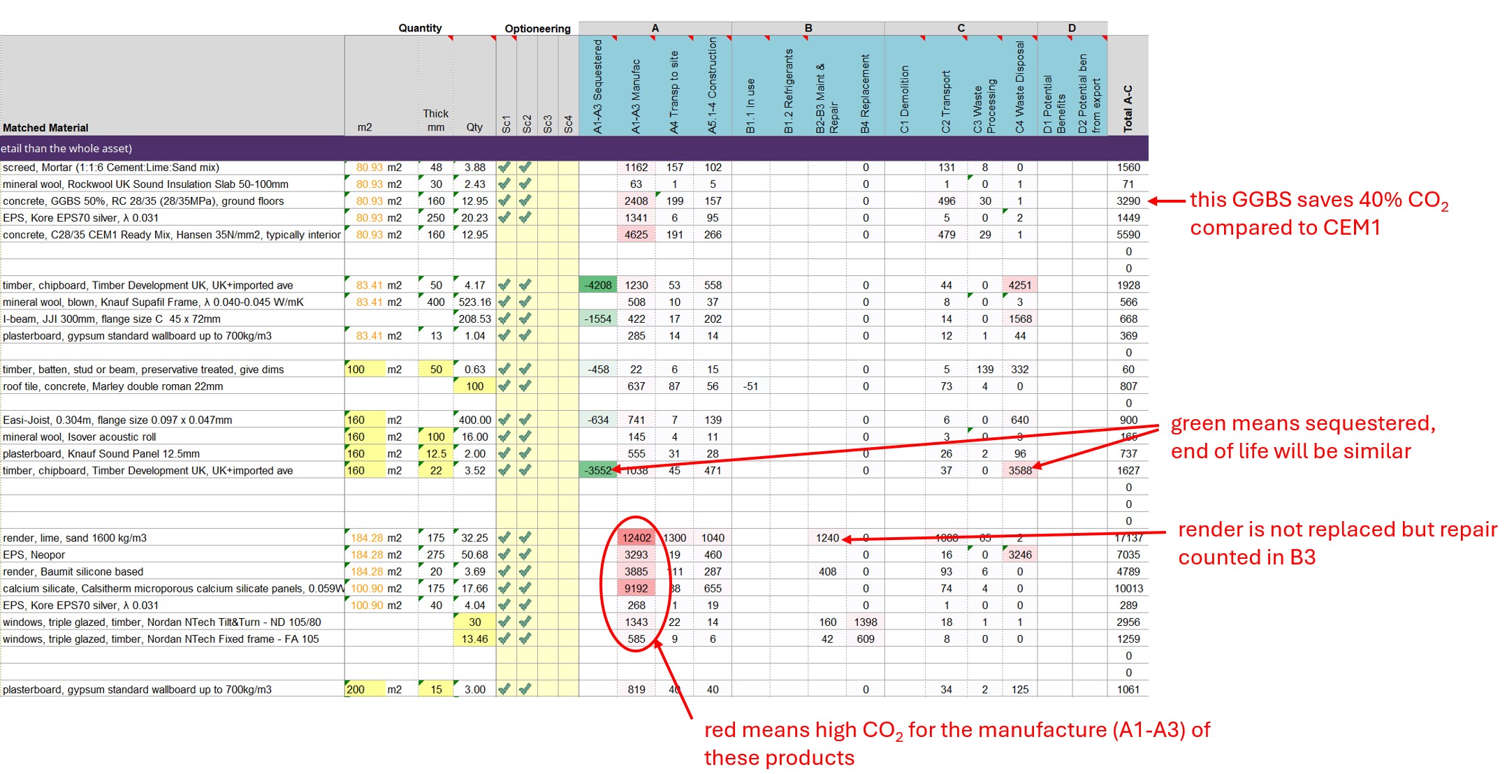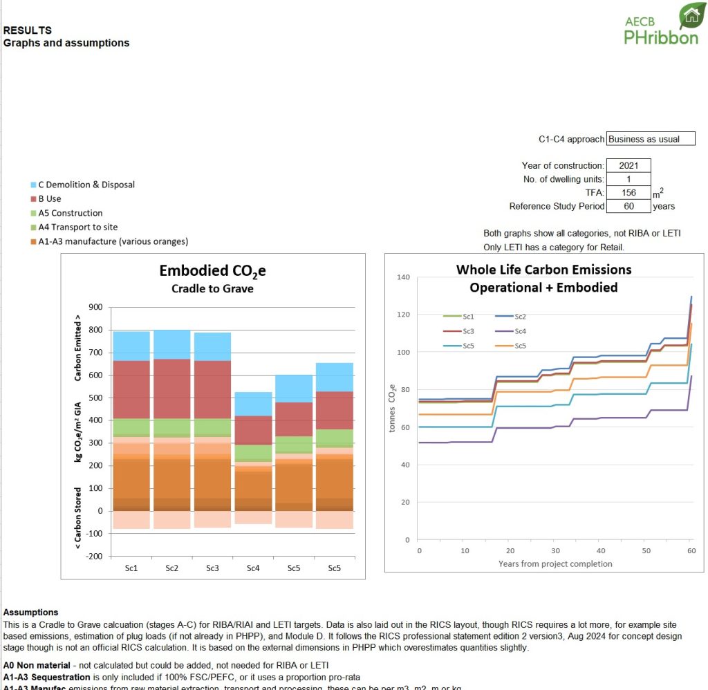 (2) For up to 12 of your options, the embodied CO2 is divided up (left) and the whole life carbon graph is given (right).