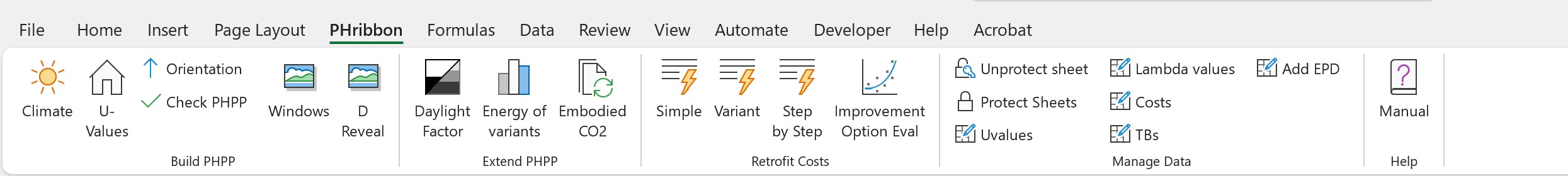 Microsoft have had the facility to add custom toolbars and buttons on the ribbon in Excel on PC’s for some time. Tim Martel has created one for the Passive House Planning Package (PHPP) called PHribbon which speeds up common tasks and extends what PHPP can do. The tools do exactly what you could have done by hand, but quicker and reducing user error. It has been marketed through the AECB for almost 7 years. PHribbon is intended for v10 PHPPs though most of it (apart from the window tool) is also suitable for older files you may have in v8.5, 9.1, 9.3 and 9.6.